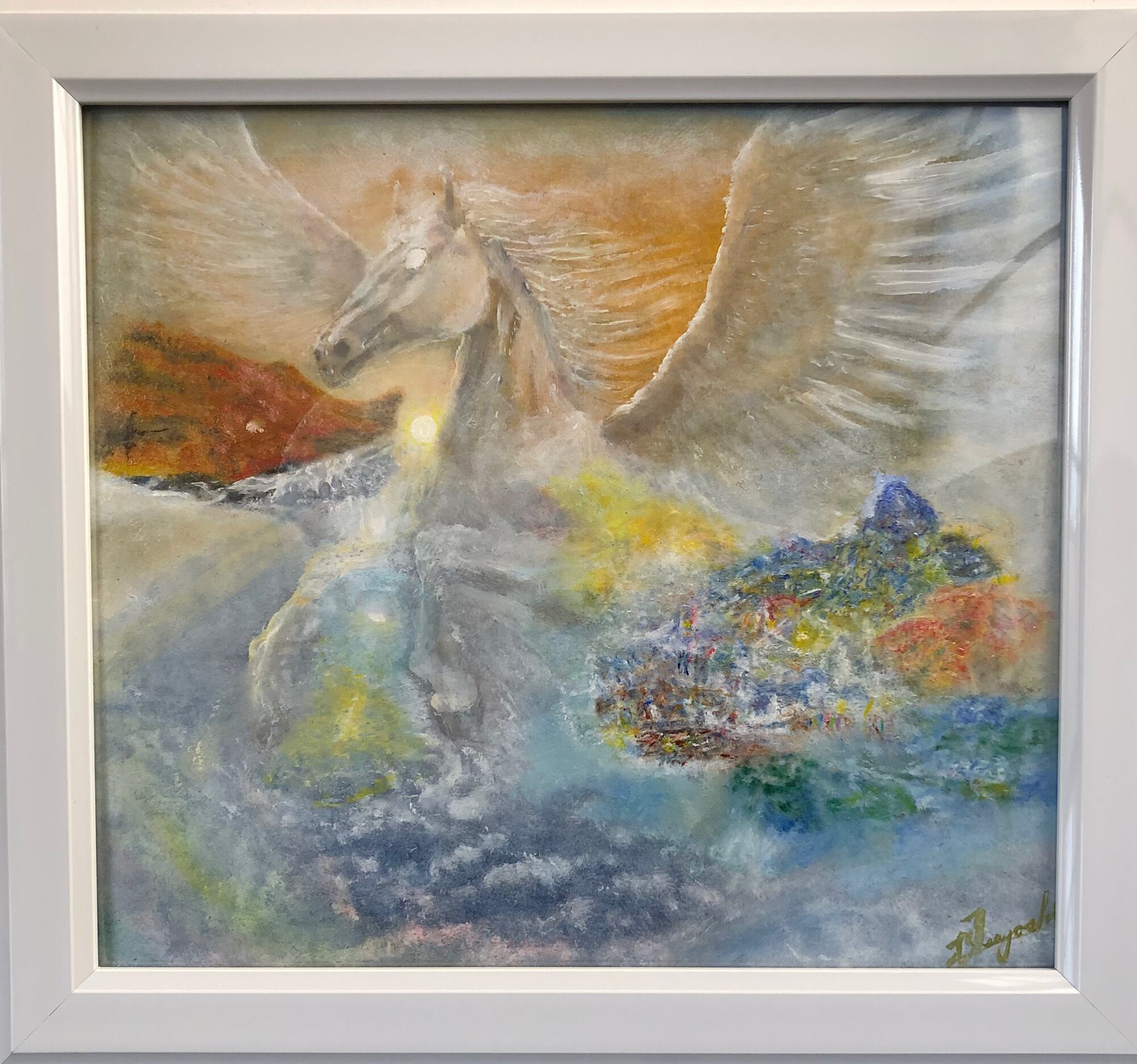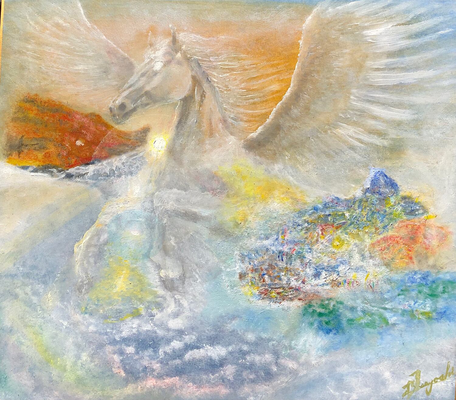 右手前の虹龍は、日々、対象物から感じ得た感覚を‘’あるがまま‘’に感覚器官で捉えて、少しずつ、ほぼ点描に近い描画で後から描き加えています。